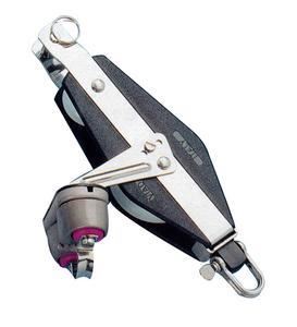 Bozzelli con sfere in acciaio inox serie rinforzata. Testa universale (tre posizioni) - in linea, trasversale, girevole Bozzello a violino con due pulegge e strozzascotte+arricavo