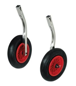 Ruote di poppa mod. pieghevole per alaggio canotti pneumatici, provviste di giunti fabbricati in acciaio inox con meccanismo per consentire un agevole sollevamento durante la navigazione ed un facile e sicuro ribaltamento al riutilizzo per il rientro.