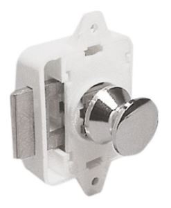 Corpo scrocco in nylon, molle inox. Per chiudere si preme il pulsante che resta a filo, per aprire si ripreme il pulsante che esce sbloccando le antine e costituendo nello stesso tempo un pomello di presa. Montaggio dello scrocco con 2 viti