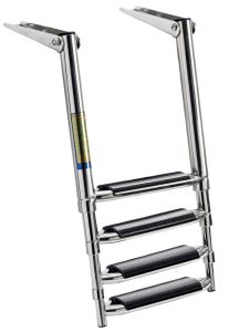 Scaletta telescopica per plancette di poppa. Costruita in acciaio inox con supporto antiscivolo sui gradini. Occupa, sulla plancetta, uno spazio ridottissimo. Gradino doppio tubolare maggiore larghezza.