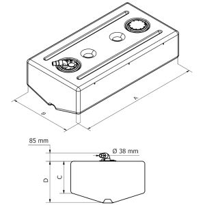 Serbatoi in polietilene alta densita', adatti agli acidi e ai carburanti, completi di boccaporto di ispezione senza indicatore. Il boccaporto e dotato di tappo con sfiato, pescante, portagomma 3/8" per sfiato aria, è inoltre predisposto per il montaggio dell'indicatore di livello elettrico o meccanico, portagomma da 1/4" per un secondo pescante per bimotore o diesel per installazioni fisse.