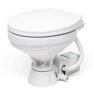 Wc elettrico completo di pompa in bronzo con girante in neoprene, albero in acciaio inox, tubo di entrata da 19mm, uscita 25mm, completo di pannello di comando, sedile e coperchio bianco soft close.