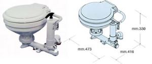 W.C. manuale con tazza in porcellana bianca. Tutti i fissaggi in acciaio o in bronzo adatti per luso in acqua di mare.
