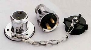 Presa e spina in ottone cromato da sovrapporre - Capacità massima 5 Amp. a 250 Volt. - Diametro base mm. 38 - Con cappuccio di protezione - Bipolare