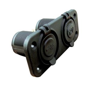 Doppia presa in policarbonato nero da incasso, tipo accendisigari e 2 USB. Utilizzabile per ricaricare telefoni cellulari, presa per faro, aspirapolvere ecc.