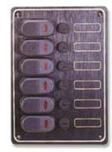 Pannello in Alluminio colore nero con interruttori ed indicatori a Led completo di portafusibili. 12 V