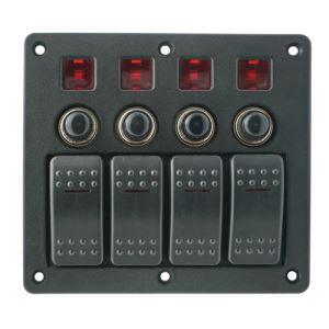 Pannello elettrico in plastica nera con interruttori basculantI, luce a LED per indicare la linea attiva e magnetotermici di protezione sovraccarico. Alimentazione a 12 vdc.