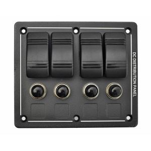 Pannello elettrico in plastica nera con interruttori basculantI, luce a LED per indicare la linea attiva e magnetotermici di protezione sovraccarico. Alimentazione a 12 vdc.