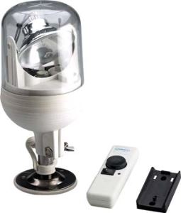 Proiettore orientabile radiocomandato, stagno. Ha un movimento orizzontale di 360° e verticale di 260°. Cupola in policarbonato ad alta resistenza meccanica e termica. Portata circa 350 mt. Completo di lampada, radiocomando e base di supporto con spinotto. 24V