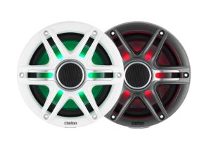 Speakers marini coassiali premium Clarion da 7,7" CMSP-771RGB con illuminazione LED RGB integrata, griglie sportive e potenza nominale di 60W RMS perfetta per l'utilizzo con gli amplificatori Clarion.