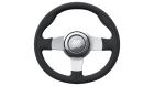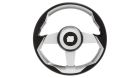 Volante con impugnatura morbida con cinque razze ricoperte da plastica nera. Ruota timone con anello in ottone lucido ø mm. 350