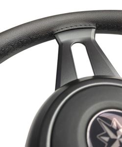 Volante a 6 razze in acciaio inox, diametro 35 cm., verniciato nero, impugnatura rivestita in pelle cucita a mano e coperchio in pelle con logo dei venti.