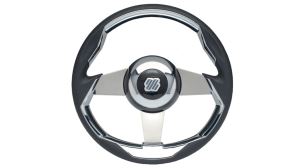Volante barca a 3 razze con impugnatura in poliuretano effetto pelle con inserti cromati, razze inox, cover cromata e verniciatura nera.