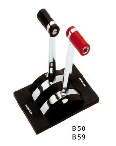 Scatole di comando bileva ad azione singola: ogni leva controlla separatamente il cavo del gas o dellinvertitore. Adatte a qualsiasi tipo dimbarcazioni con motore fuoribordo, entrobordo e gruppi poppieri provvisti dinvertitore idraulico. - leve dritte cromate gas+invertitore con blocco di sicurezza