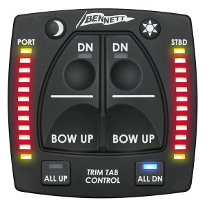 Indicatore di assetto OBI Bennett 12/24V con pulsanti Rocker, indicatori LED, dimmer di luminosità e centralina Auto Tab Retractor (ATR) integrata nel pannello. Comprende due teste pistone con sensori e cavi per il collegamento. Può essere installato su qualsiasi scafo con flaps Bennett, l'ATR fa rientrare automaticamente i flaps quando si disinserisce la chiave di accensione.