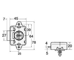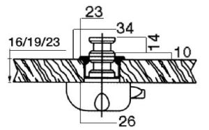 Corpo scrocco in nylon, molle inox. Per chiudere si preme il pulsante che resta a filo, per aprire si ripreme il pulsante che esce sbloccando le antine e costituendo nello stesso tempo un pomello di presa. Montaggio dello scrocco con 2 viti