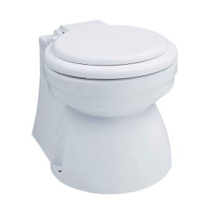 W.C. elettrico con tazza in porcellana bianca. Pompa autoadescante con girante elastica. Motore a magnete permanente con albero in acciaio inox.