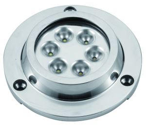 Luce subacquea a LED 6 x 3W, in acciaio inox AISI 316. Montaggio allo specchio di poppa. 15W. Durata 50000 ore. Fornita con cavo mt 1,5. Stagna IP68. Luce fredda 5500-6300 Kelvin. Installazione sotto la linea di galleggiamento. (Garantire il passaggio dellacqua tra la luce e la carena per un corretto raffreddamento della luce).